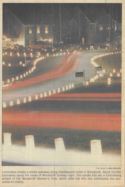 From the club’s earliest days one of the goals was to raise monies to donate to local charities. If we could involve the community, it was even better. Starting in 1985-yes, that first club year-WWC began selling luminary kits to the residents of all Woodcroft neighborhoods to celebrate the holiday season. This was no small task but the display each December was dazzling! The cost for many years was 25¢/kit which included a white bag and a candle. Sand to fill the bags was donated and available at the Woodcroft Swim Club parking lot. Residents were asked to line their street fronts and sidewalks on a chosen night and time. In the beginning, local businesses sponsored the luminaries for Woodcroft Pkwy and Boy Scouts helped with the large task of placing and lighting them. It took many members and community volunteers to organize, from the ordering and storing of supplies, the selling and delivering of kits, folding the bags for the parkway, placing and lighting luminaries, and next-day clean-up. Entire families got involved; my kids loved helping me fill the bags with sand and place them and then watching as I lit the candles.After the lighting, pedestrians and cars (with only parking lights on) would slowly wind their way through the streets to take in the glowing spectacle. It truly was magical!